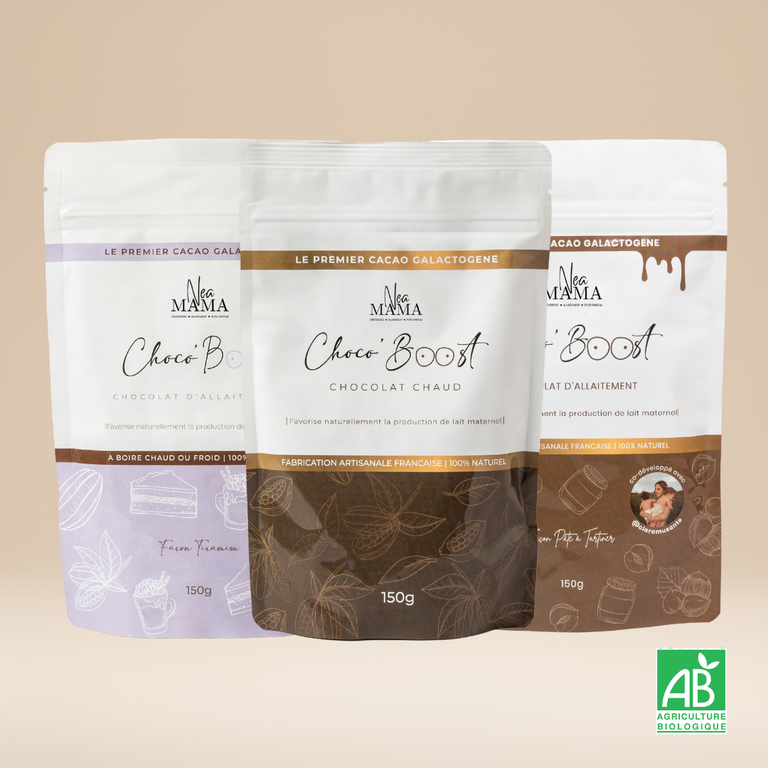 Le Pack Trio ChocoBoost réunit trois recettes gourmandes de cacao d’allaitement – Original, Tiramisu et saveur Pâte à tartiner – formulées à partir d’ingrédients naturellement galactogènes, reconnus pour accompagner la lactation de manière douce et naturelle.