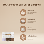 Parce qu’allaiter demande beaucoup d’énergie. En plus de ses vertus galactogènes, Chocoboost est une source naturelle de minéraux, de fibres et de bons gras. Il t’aide à lutter contre la fatigue, à stabiliser ton énergie et à t’offrir un petit rituel gourmand qui fait du bien au corps comme au moral.